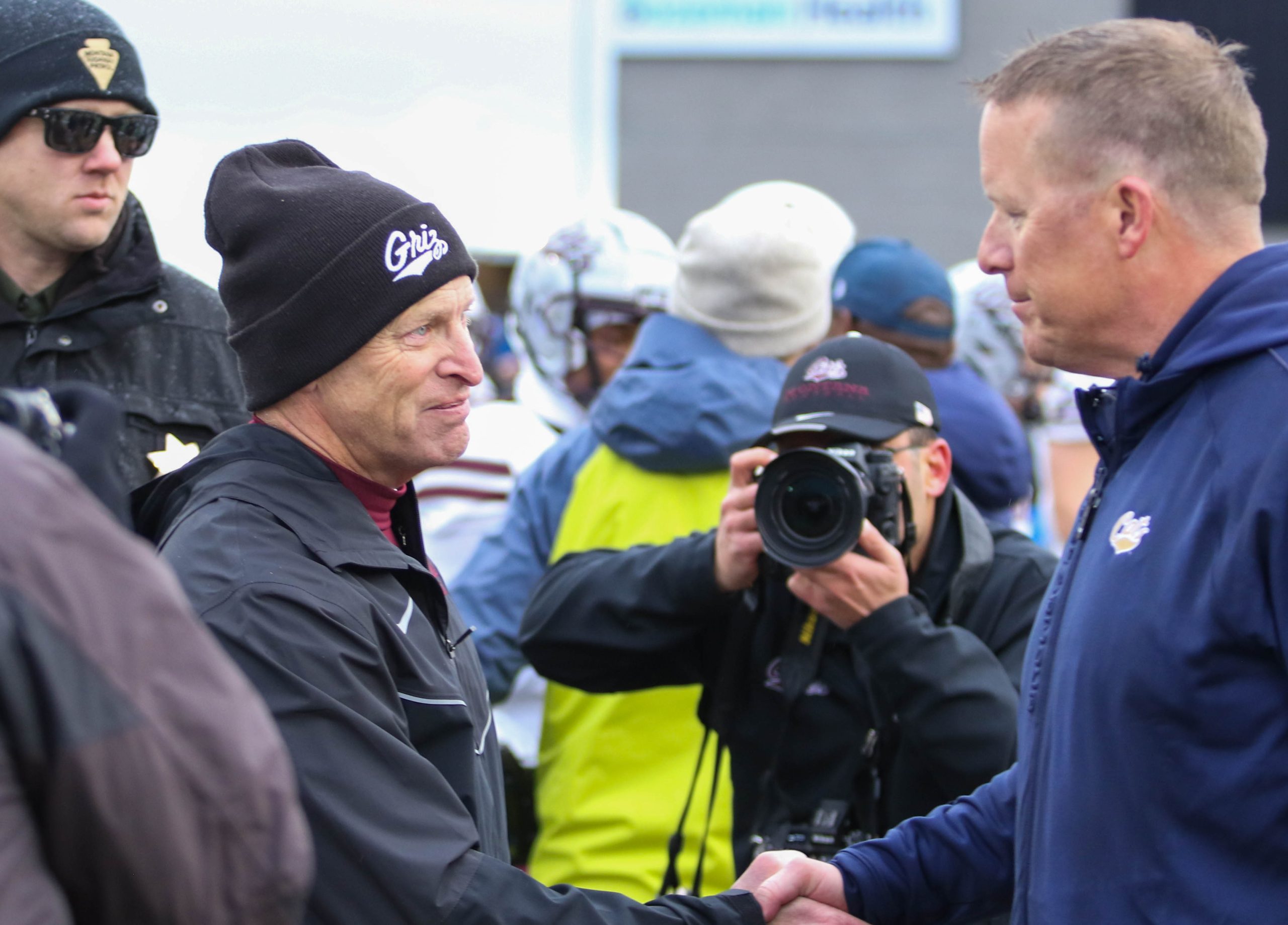 Montana State head coach Brent Vigen (left) and Montana head coach Bobby Hauck following UM’s 37-7 win in Missoula in 2023/ by Brooks Nuanez