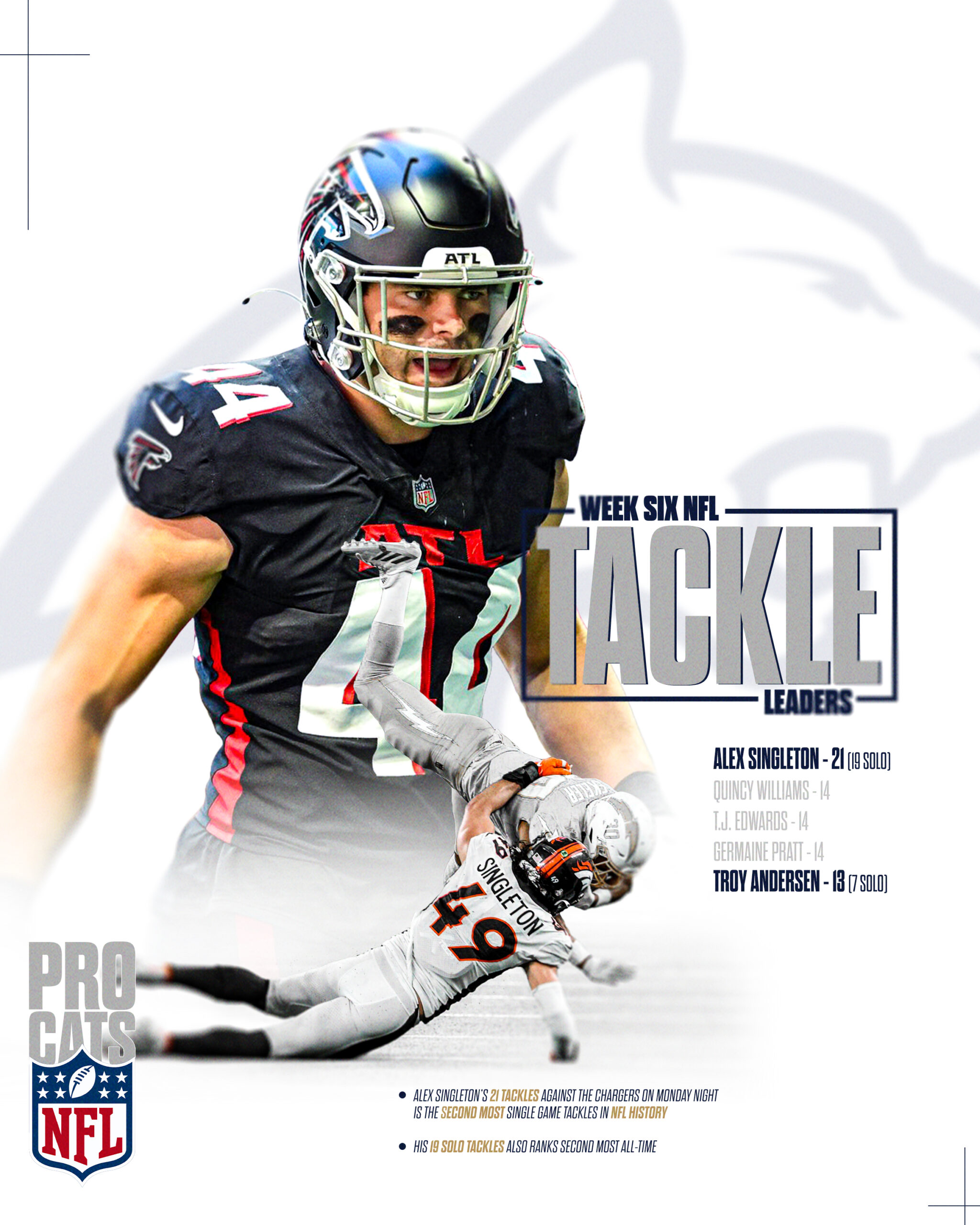 Linebackers Alex Singleton, a four-year NFL veteran, and Troy Andersen, who’s in his rookie season, both had game-highs in tackles. Of the 14 NFL games played in Week 6, they were the leading tacklers in two of them. As if that’s not enough, Andersen did so in his first starting assignment for the Atlanta Falcons and Singleton just missed tying a league record for solo tackles on Monday Night Football for the Denver Broncos.