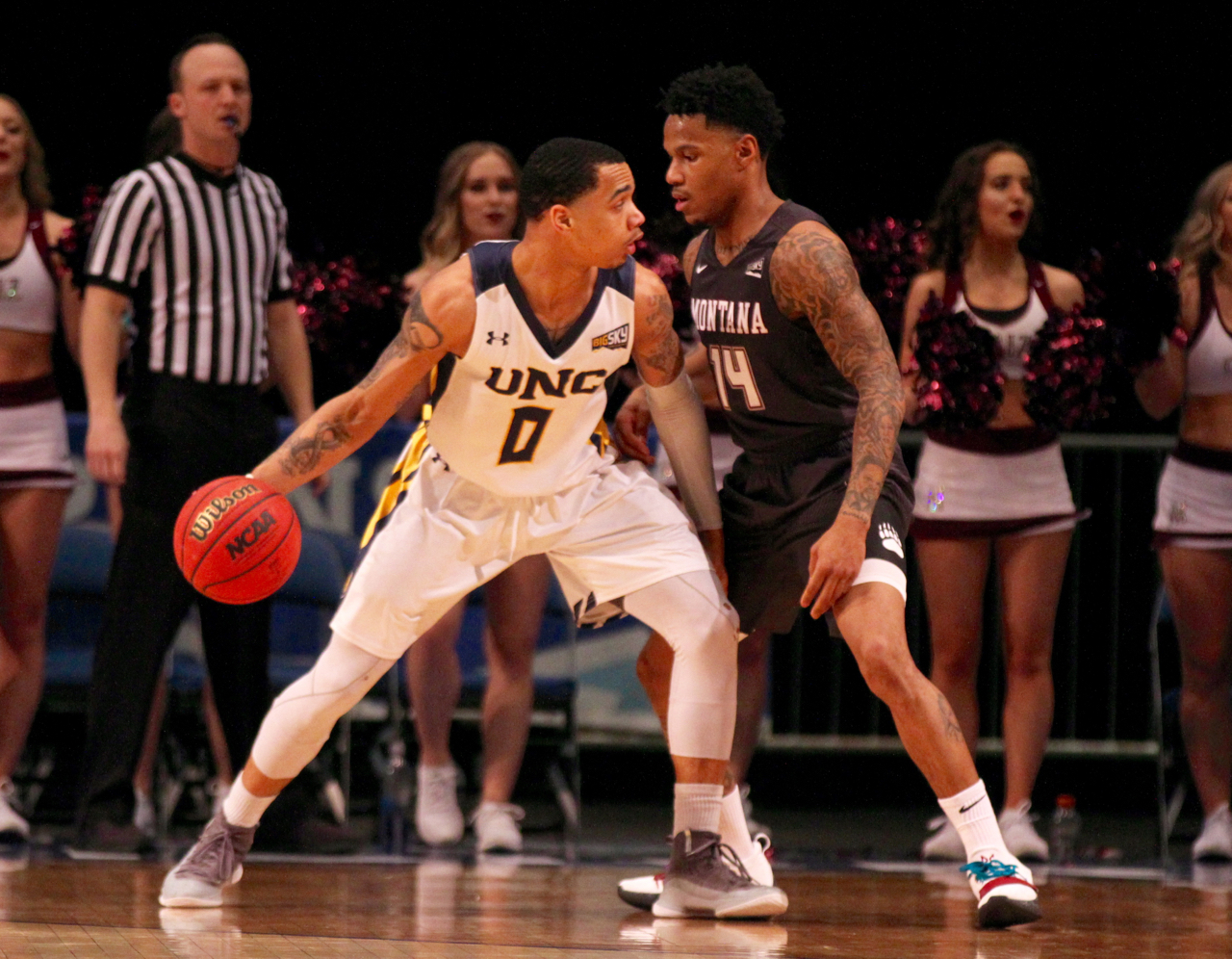 Northern Colorado senior Jordan Davis (0) backs down Montana senior guard Ahmaad Rorie (14) in 2018/ by Brooks Nuanez