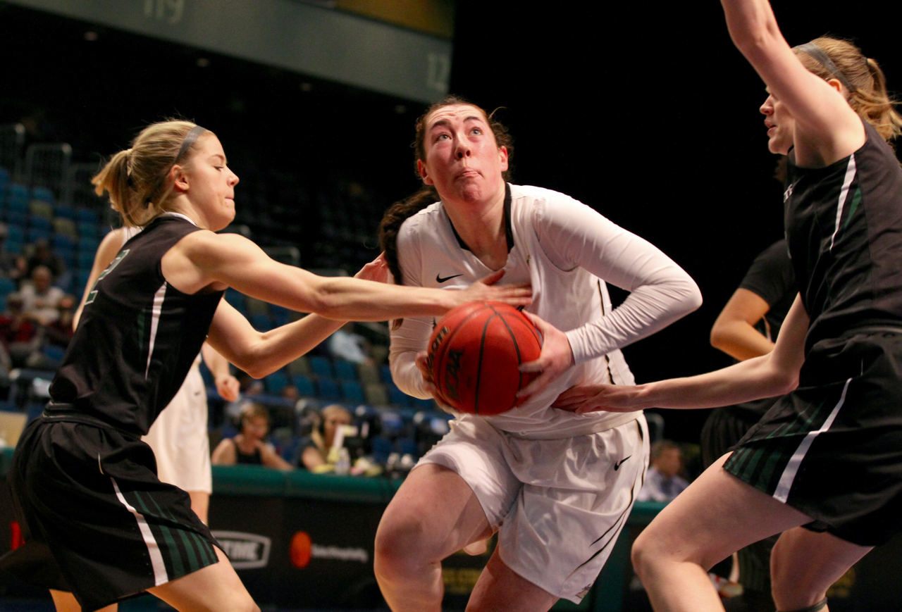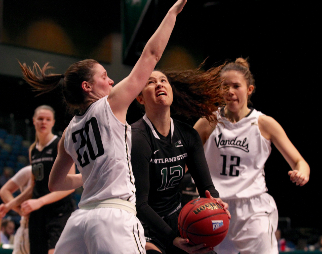 Porttland forward Tatiana Streun (12) blasts through Idaho guard Allison Kirby (20) and forward Nejra Solo (12)/by Brooks Nuanez