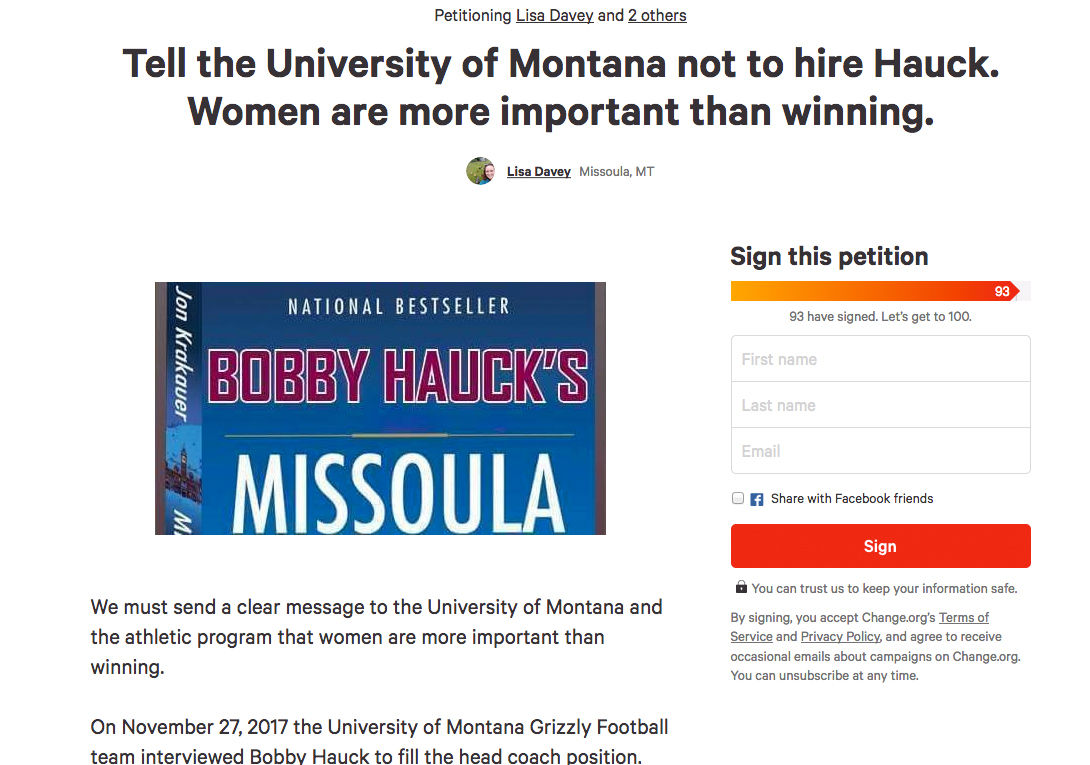 In the midst of swirling rumors and back and forth arguments over who should be the next head football coach of the Montana Grizzlies, a petition started by a local woman working in conjunction with a local advocacy group has urged Montana athletic director Kent Haslam to reconsider the man reported to be the front-runner for the job.