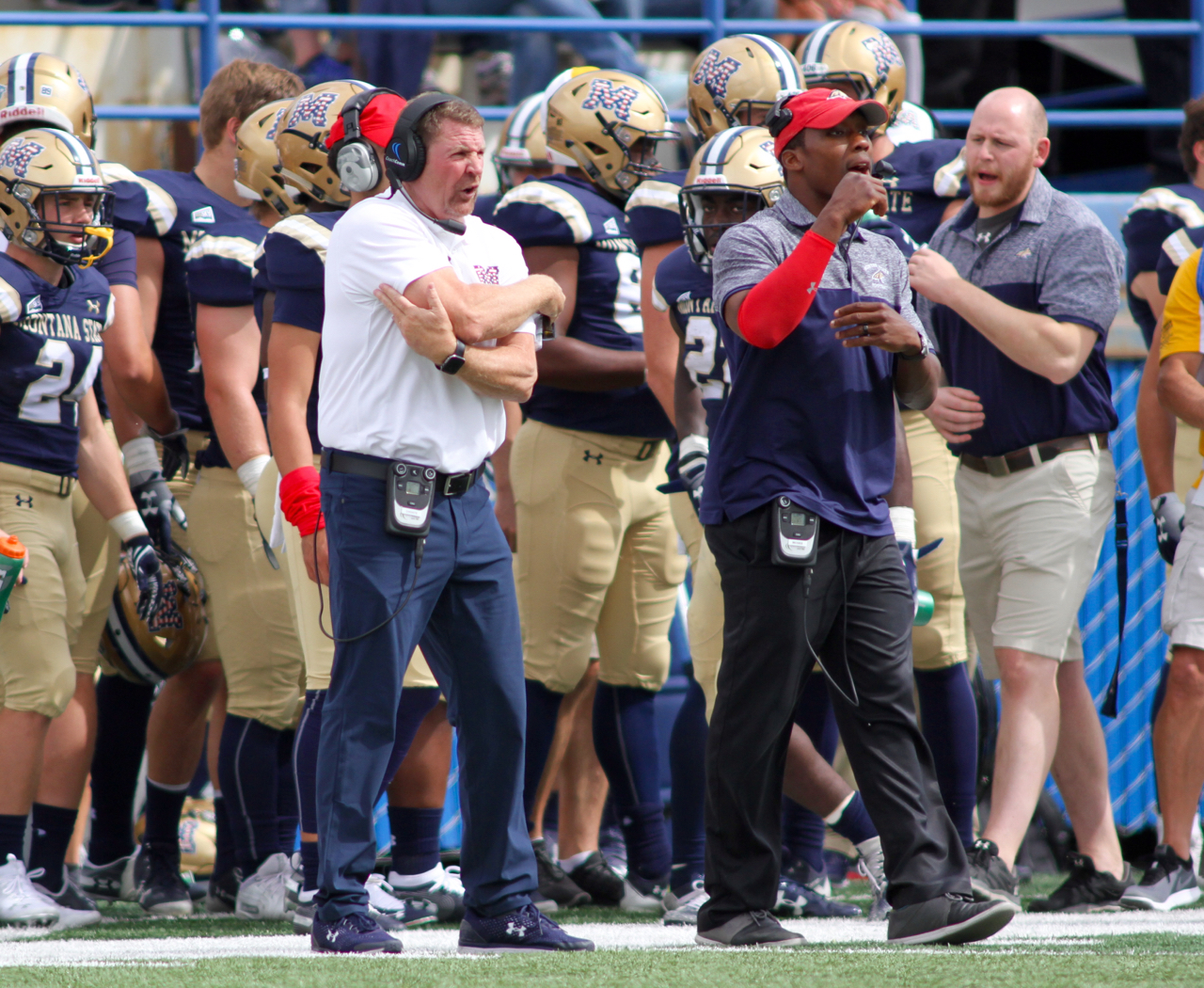 Montana State head coach Jeff Choate signals offensive play calls with running backs coach DeNarius McGhee/by Brooks Nuanez