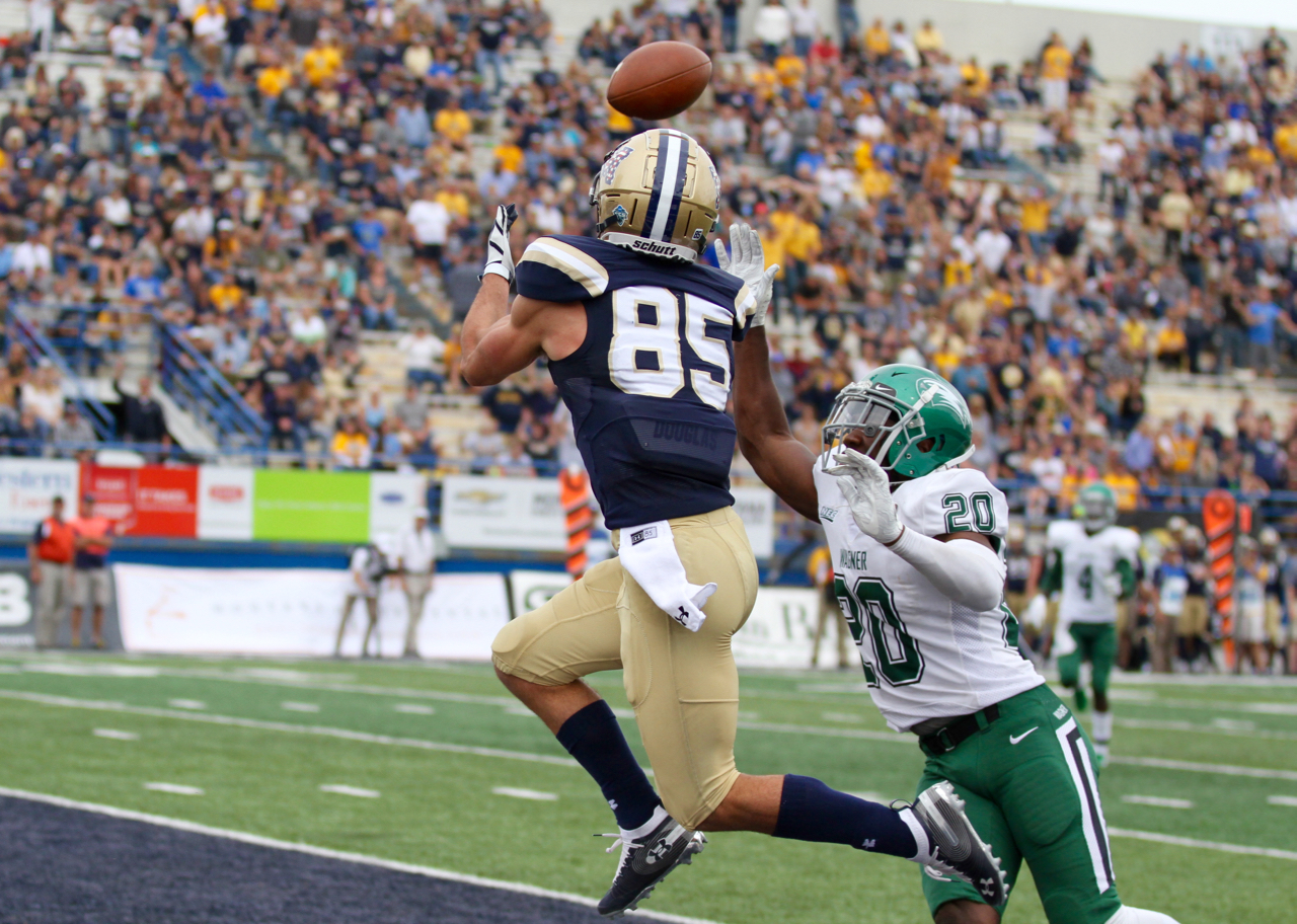 Montana State wide receiver Kevin Kassis (85) catches his second touchdown vs Wagner/by Brooks Nuanez