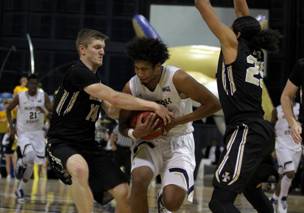 Idaho guard Victor Sanders (11) looks for space vs. Bobcat defender Zach Green (0) & Devonte Klines (10) in 2017/by Brooks Nuanez