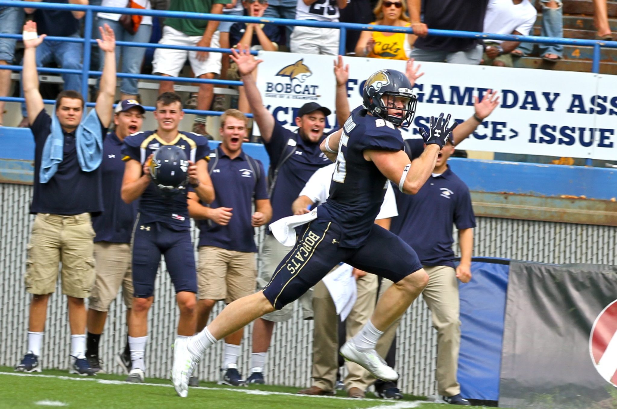As Beau Sandland crossed the line of the south end-zone at Bobcat Stadium, he stood and admired the sea of blue and gold, each of his bulging arms stretched out to his sides as he took in his new home in full force for the first time.