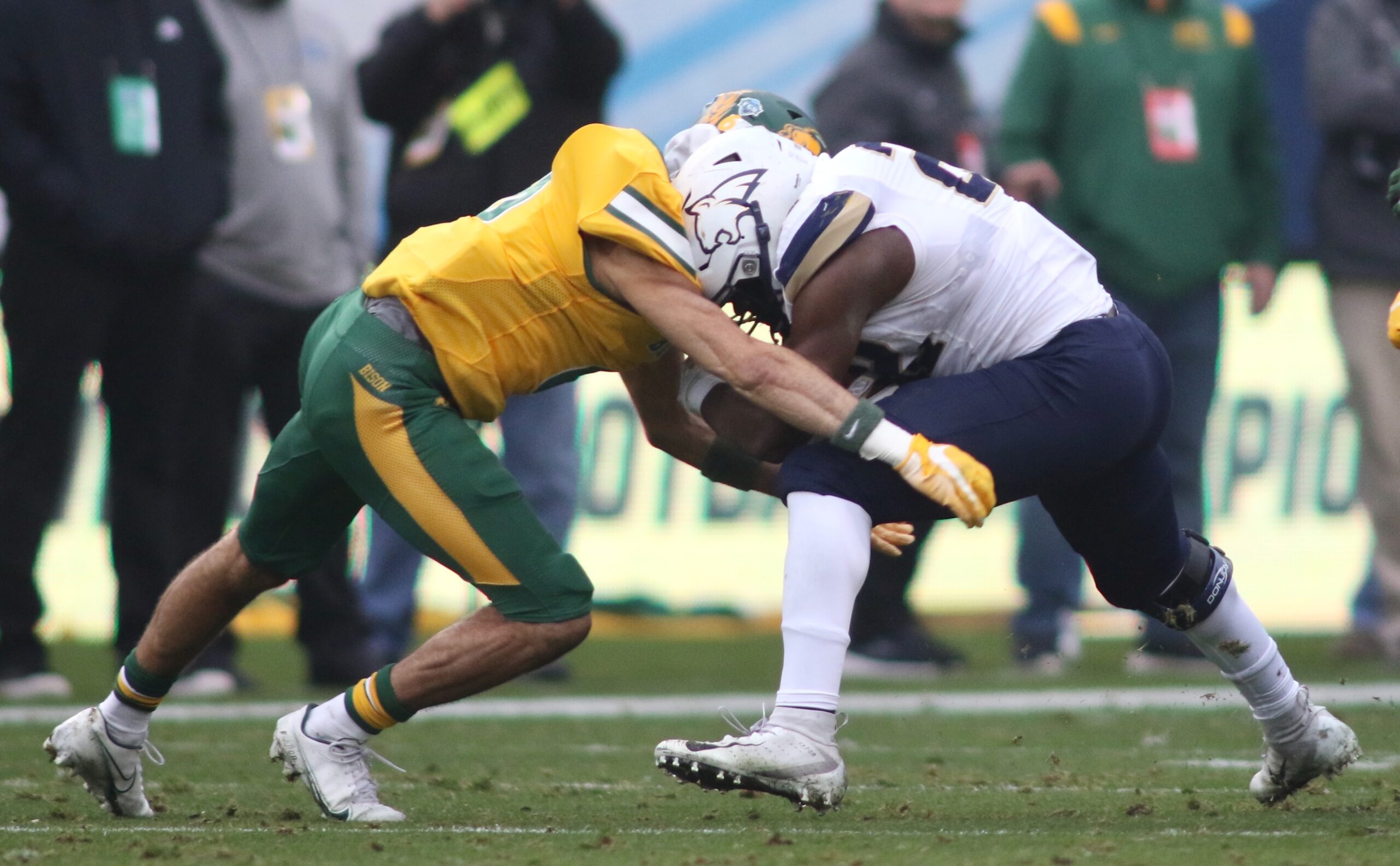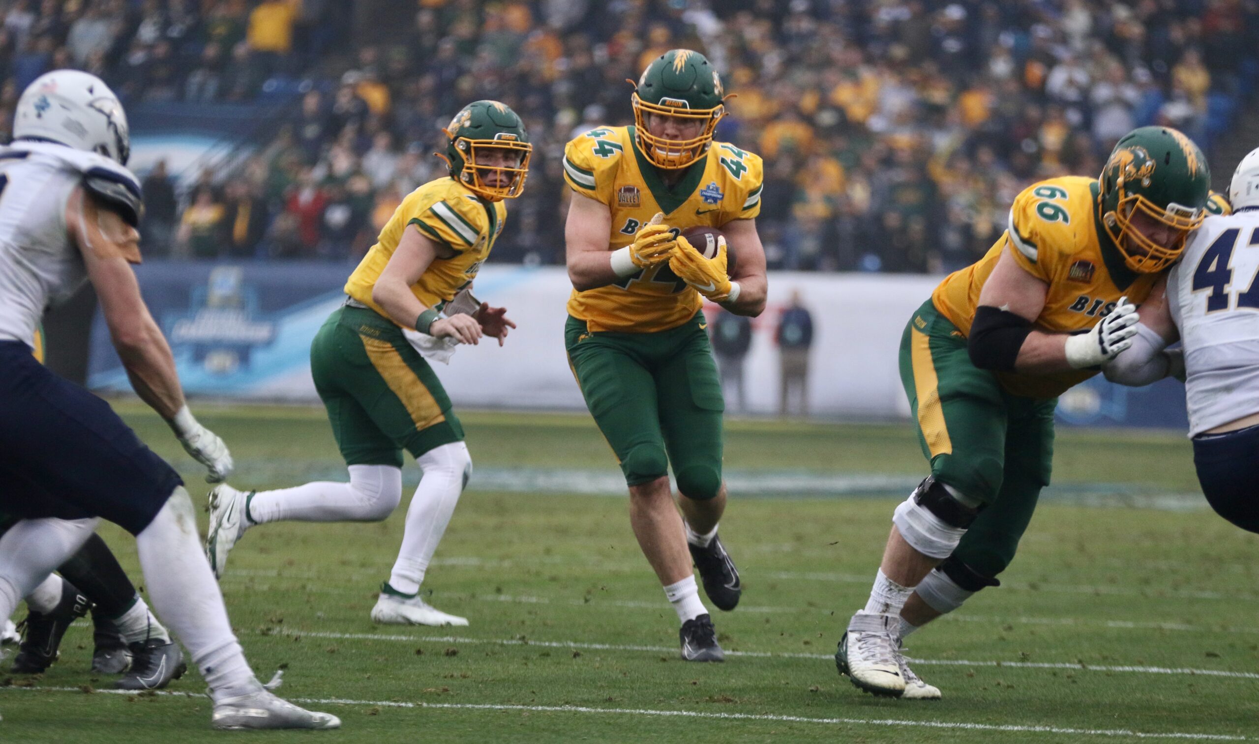 Because of those accomplishments and adulation coming into Saturday’s showdown, the visual that played out on the sopping wet Bermuda grass was striking. North Dakota State blew Montana State off the ball consistently, averaging an astounding 7.2 yards per rush on 53 carries. And that’s with MSU piling up 268 yards on 25 carries in the first half, including a 76-yard touchdown on by NDSU junior Kobe Johnson that put the perennial powers up 21-0 before the contest was even 20 minutes old.