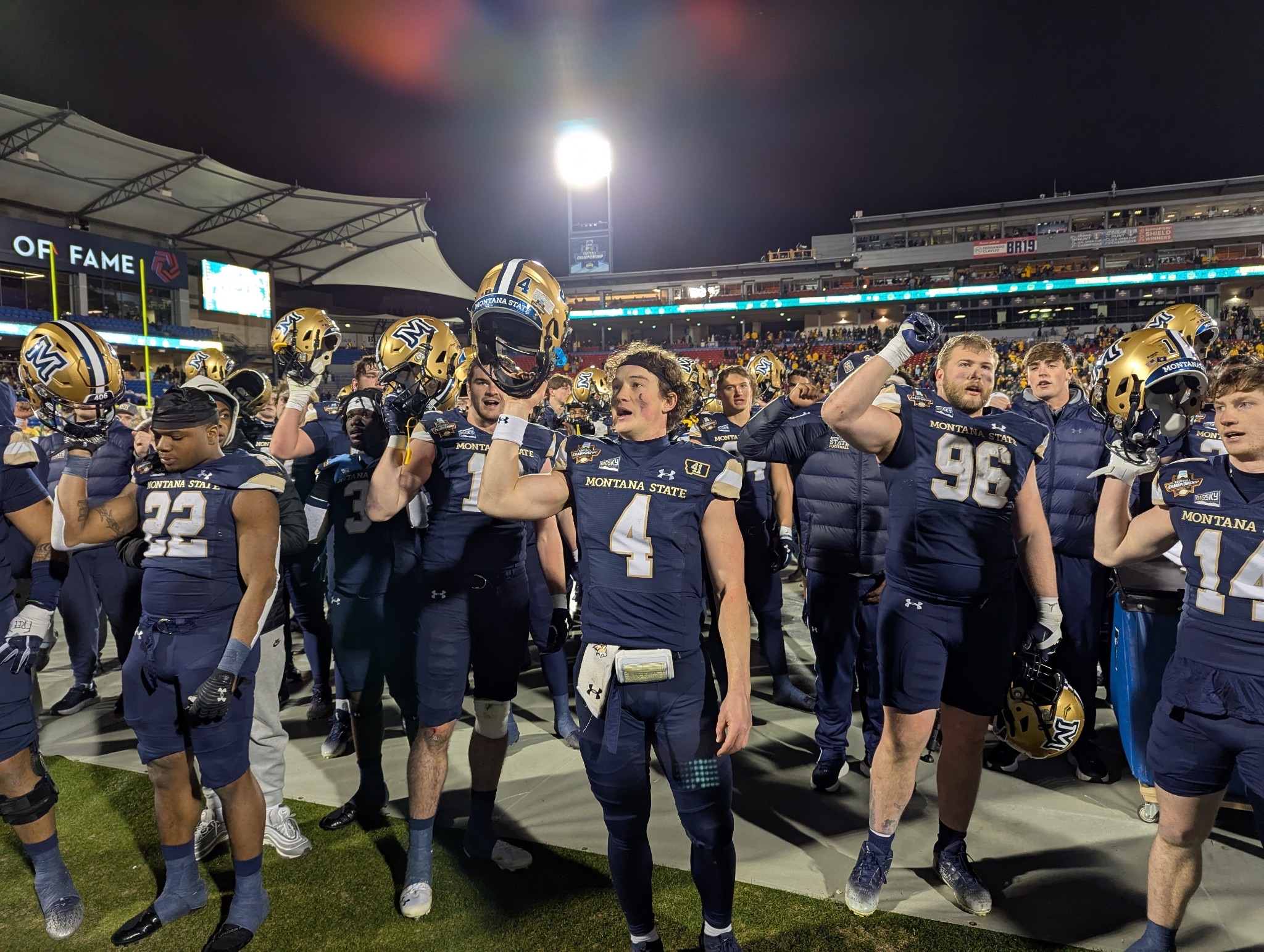 On the field, the postgame chaos continued to expand. Fans in blue in gold made their way down from the stands – fathers and sons, mothers and daughters, former teammates and old men who had seen Montana State’s last and only national championship in 1984. All of them seemed to have one goal – to shake Tommy Mellott’s hand – and, one by one, they offered Mellott the only thing they could say.