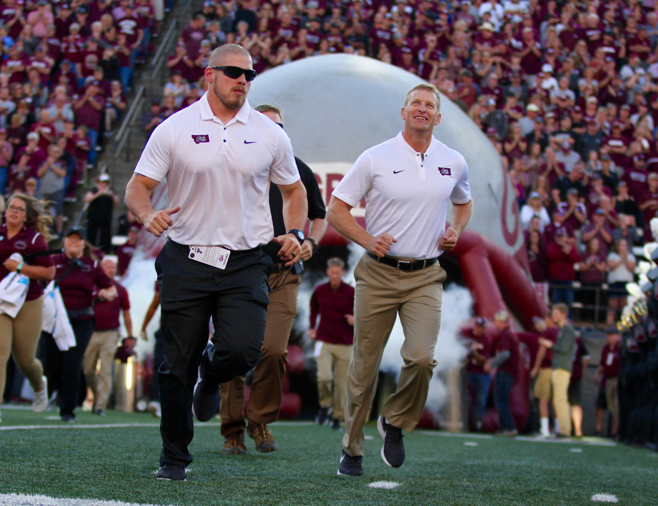 Montana head coach Bobby Hauck runs onto the field at Washington-Grizzly Stadium in 2018/by Brooks Nuanez