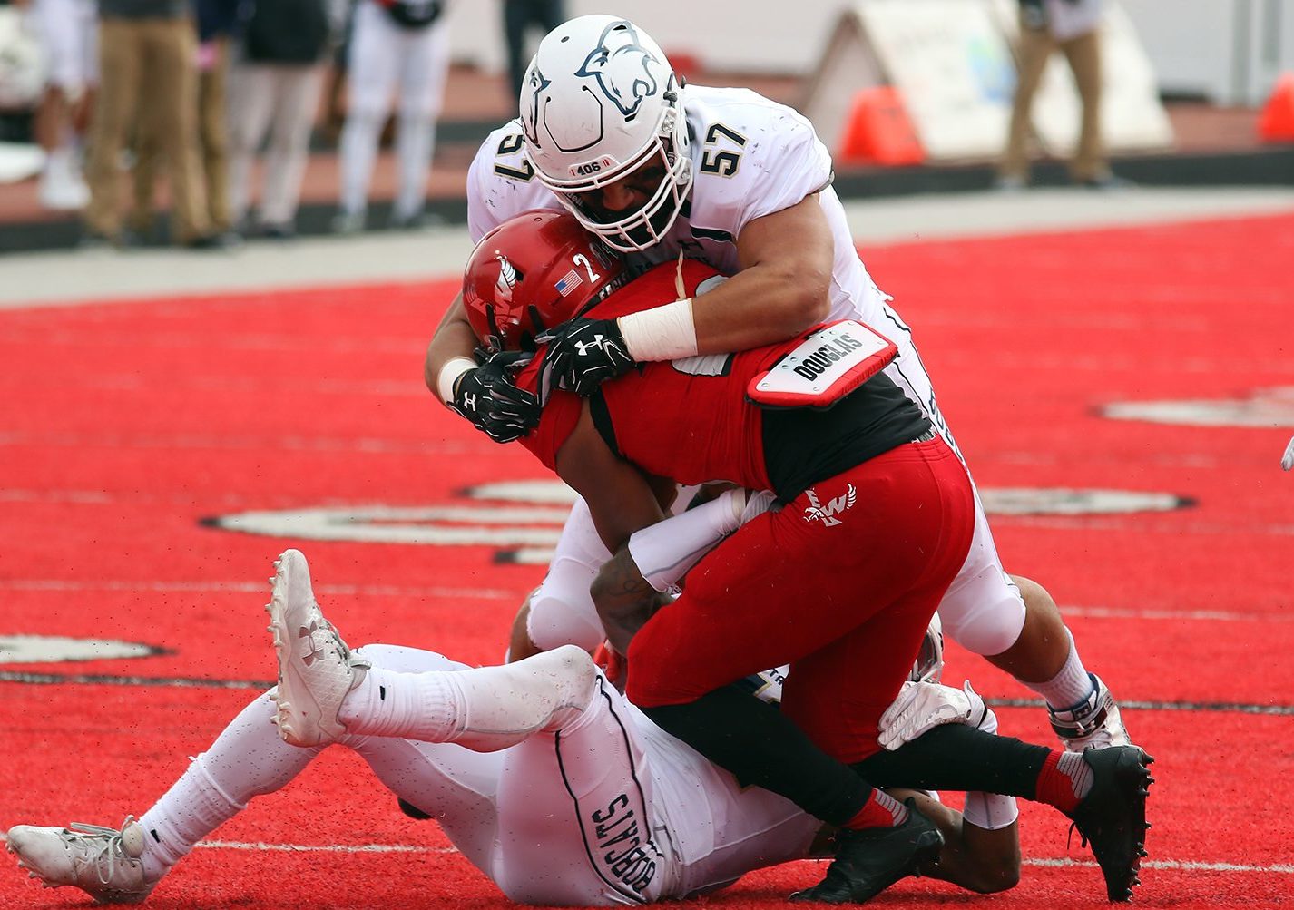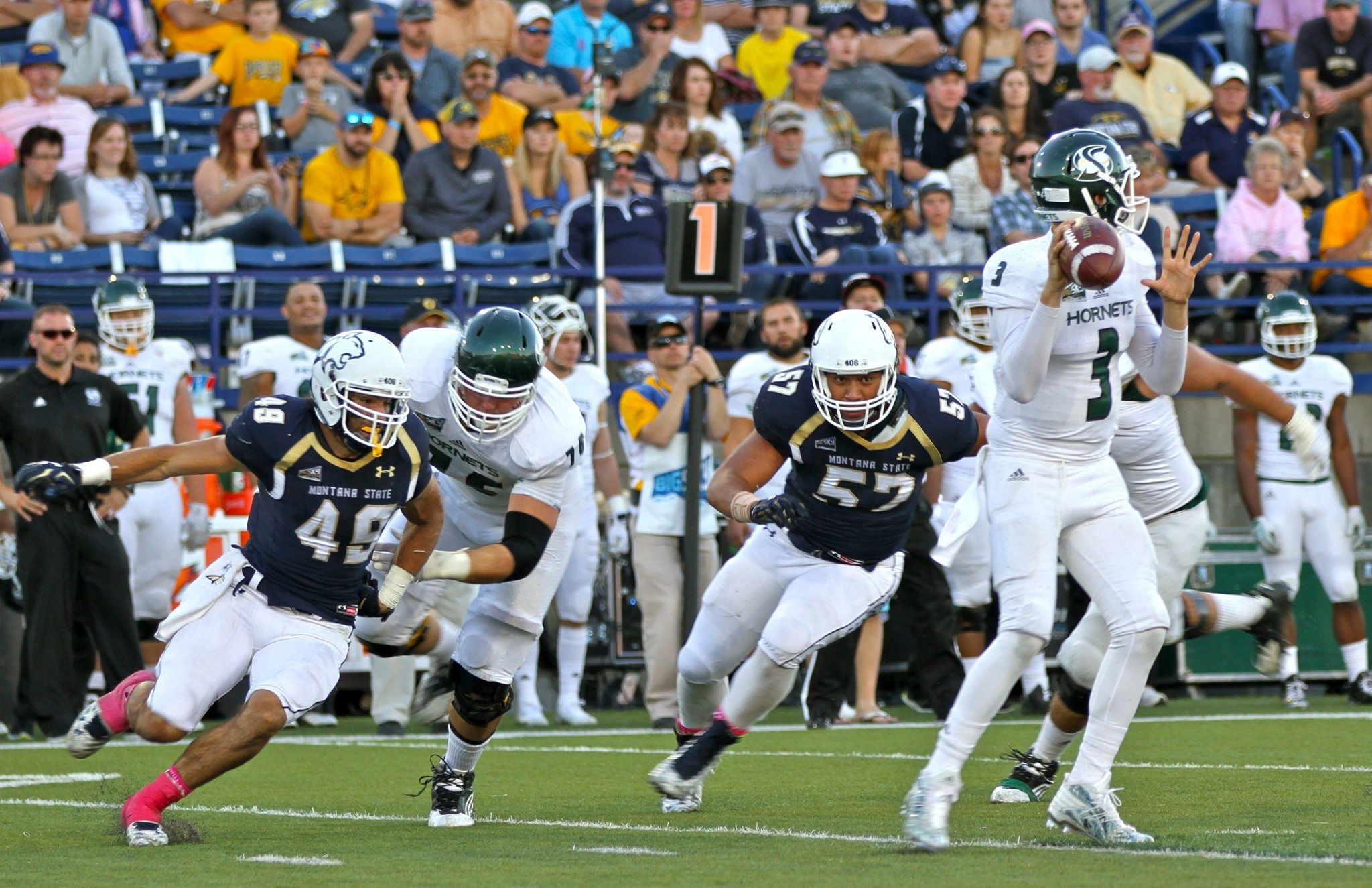 The true freshman defensive end did not bite on the fake handoff, instead setting the edge before blasting WSU quarterback Billy Green, driving him into the Bobcat Stadium turf with authority.