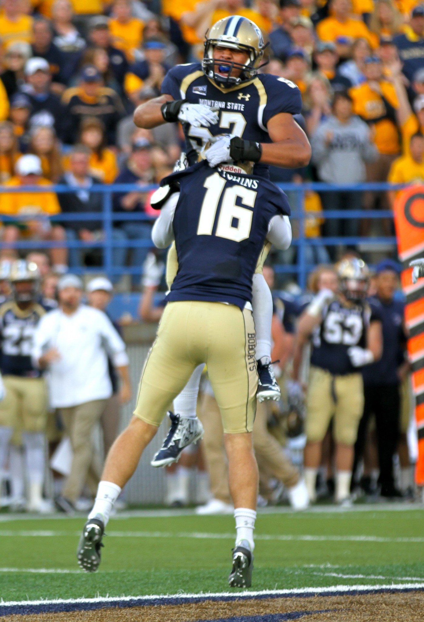Montana State defensive end Tyrone Fa’anono (57) goes up top with former linebacker Zach Hutchins (16)/by Brooks Nuanez