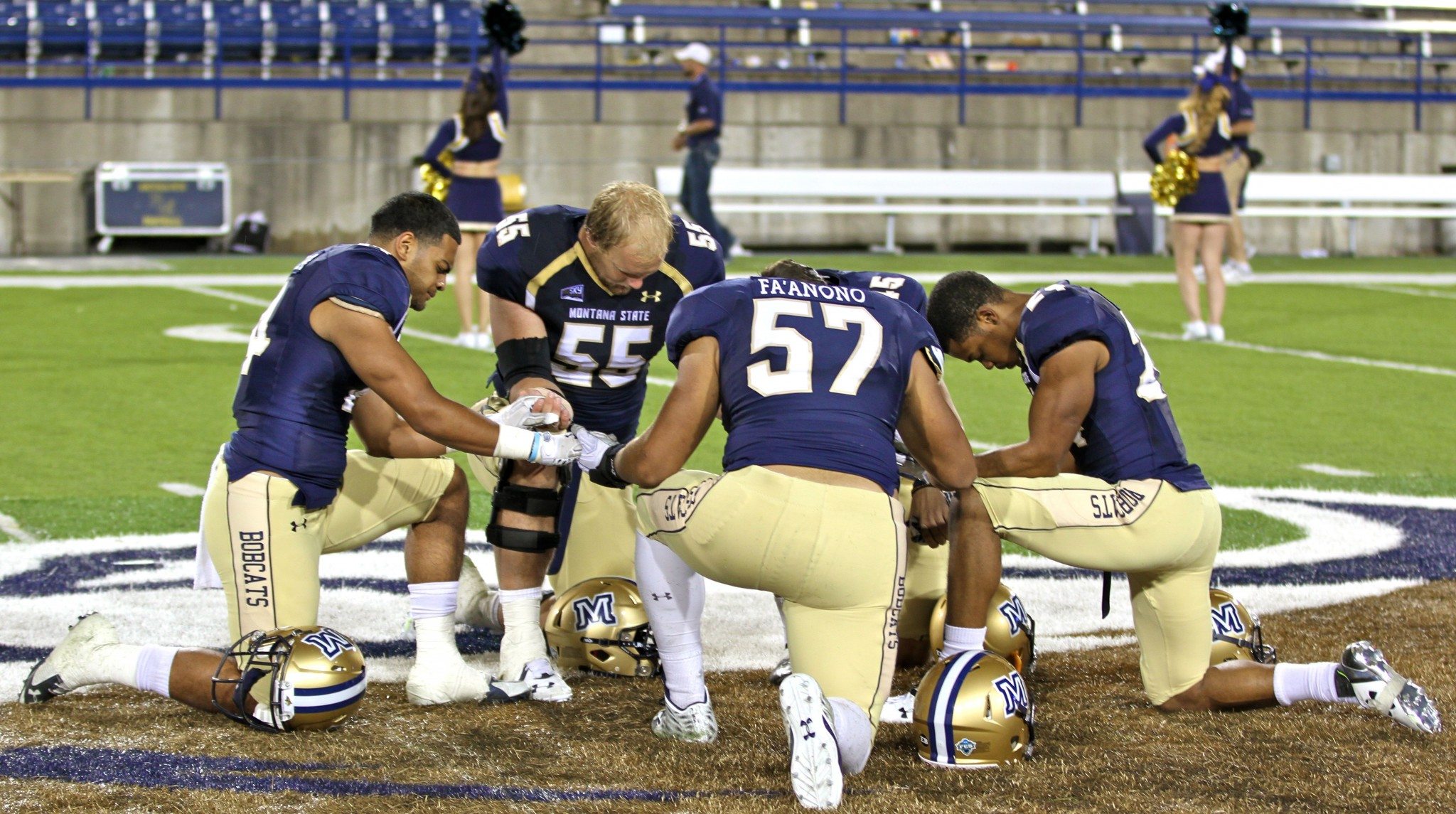 Montana State players including defensive end Tyrone Fa’anono (57) praying after a game in 2015/by Brooks Nuanez