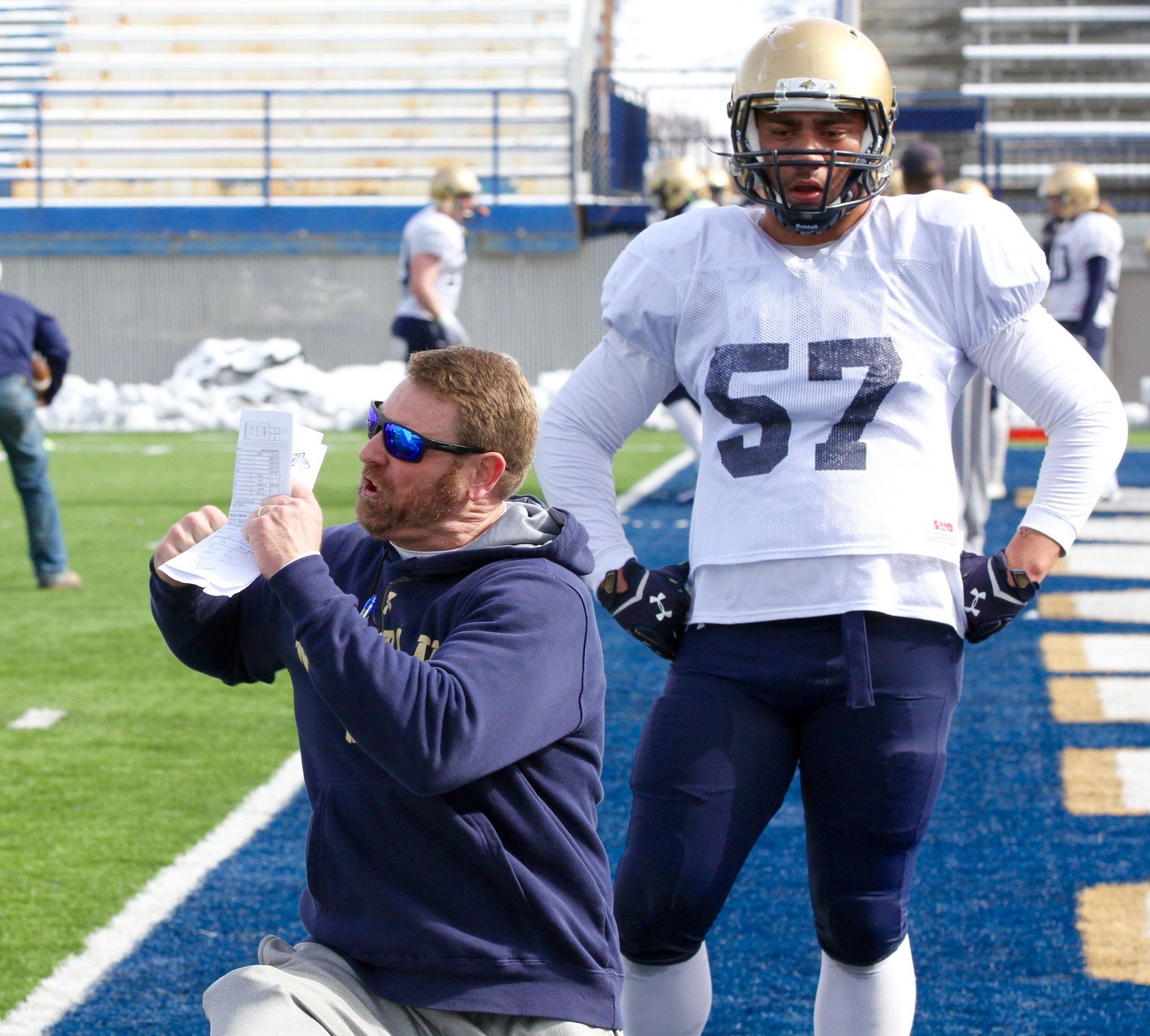 Montana State head coach Jeff Choate coaches defensive end Tyrone Fa’anono (57) in 2016/by Brooks Nuanez