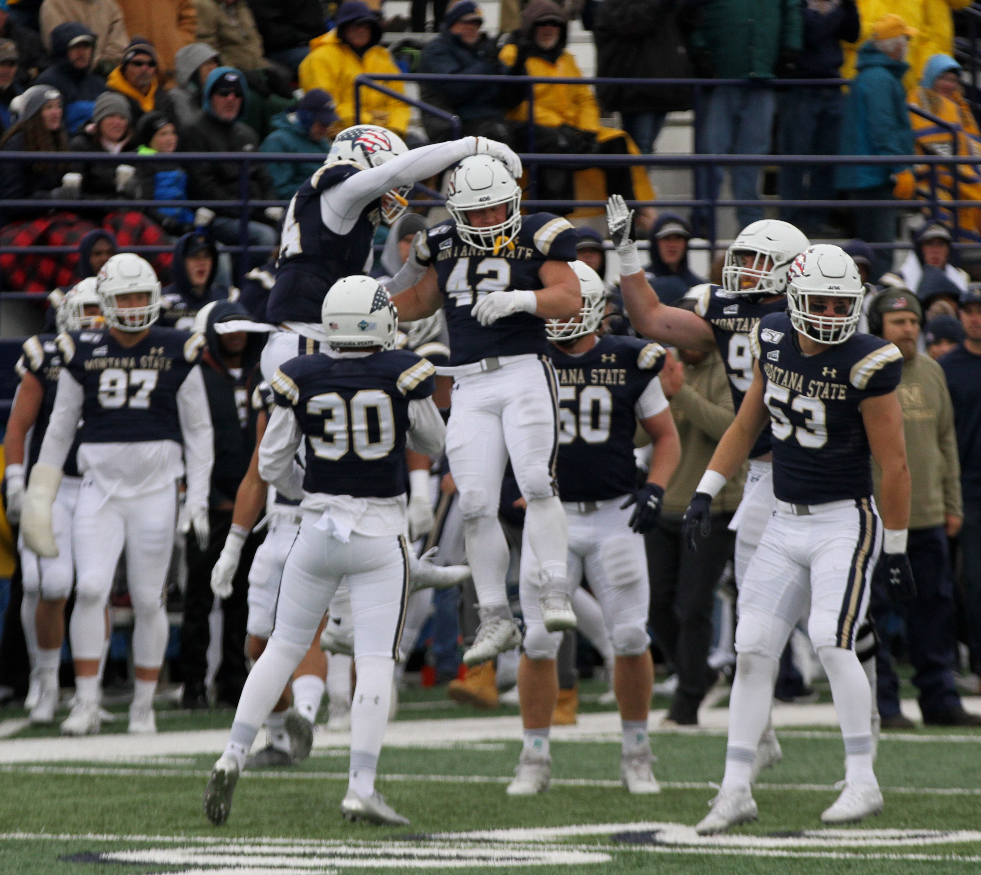 Montana State fullback RJ Fitzgerald (42) celebrates a special teams tackle in 2019/by Brooks Nuanez