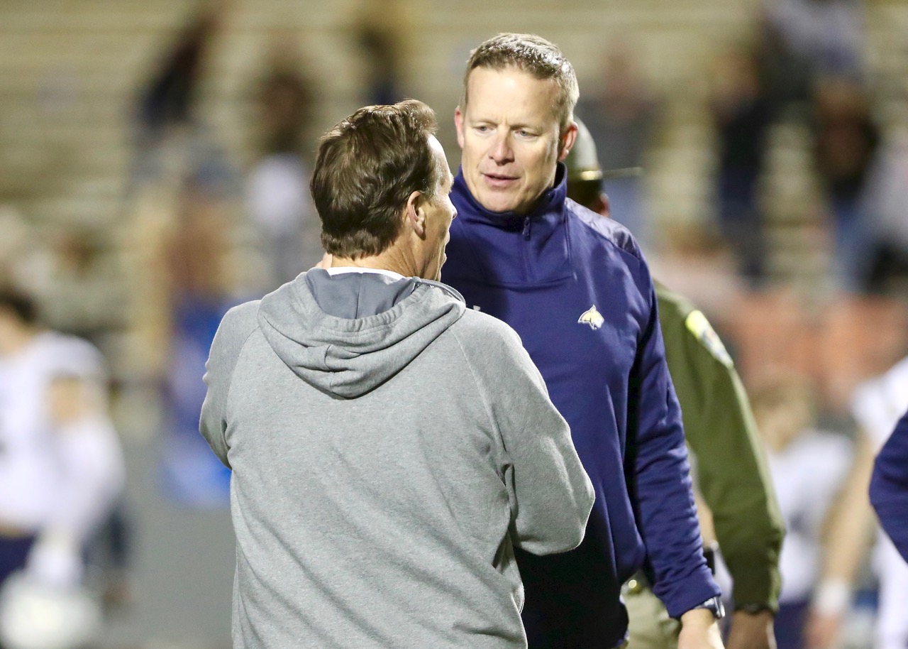 Montana State head coach Brent Vigen shakes Sam Houston State head coach K.C. Keeler’s hand after MSU’s 42-19 win over SHSU in Huntsville, Texas in December of 2021/ by Blake Hempstead